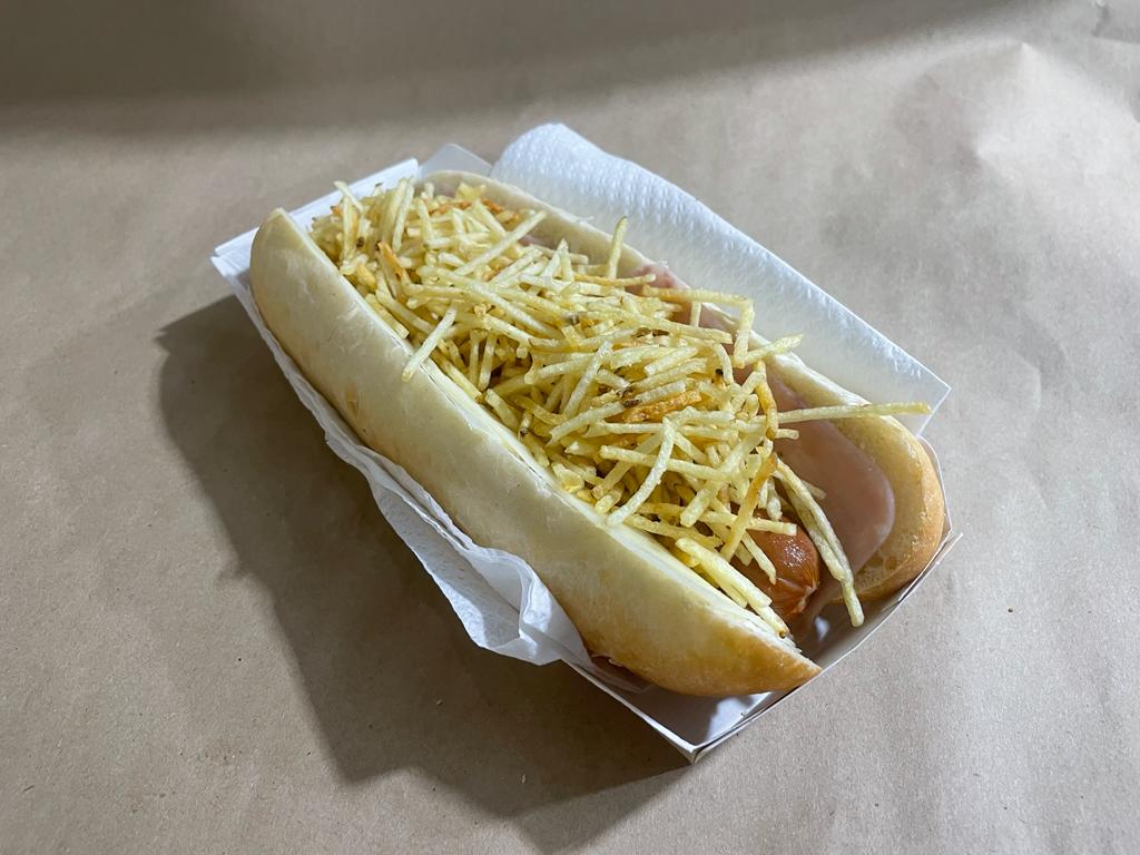 Salcicha, fiambre, queijo, batata palha, molhos, pão