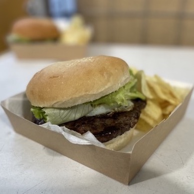 Hamburguer de Bovino ou frango, ovo, queijo, alface, pão, batata frita, molhos