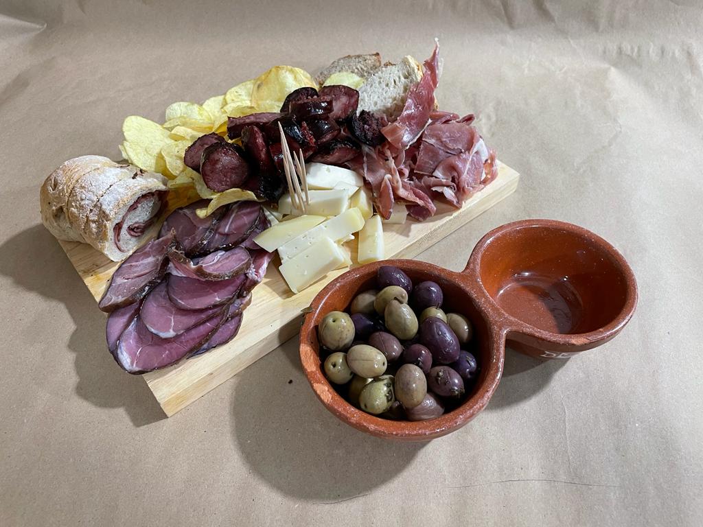 Queijo, presunto, salpicão, batata frita, chouriço assado, pão, azeitonas
